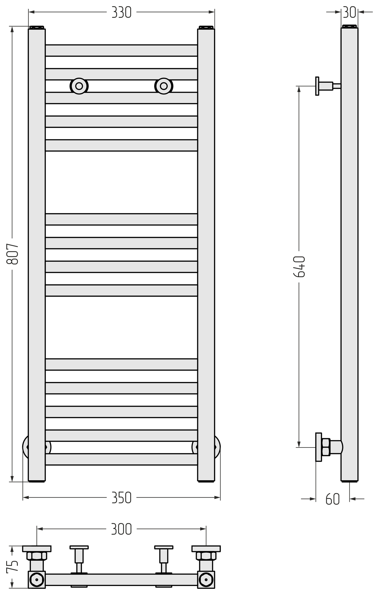 Комплектация: полотенцесушитель, элементы с накидной гайкой для подключения, спускные клапаны, телескопические кронштейны, отражатели и эксцентрики, заглушки для коллектора, комплект прокладок, шестигранные ключи, дюбели и саморезы