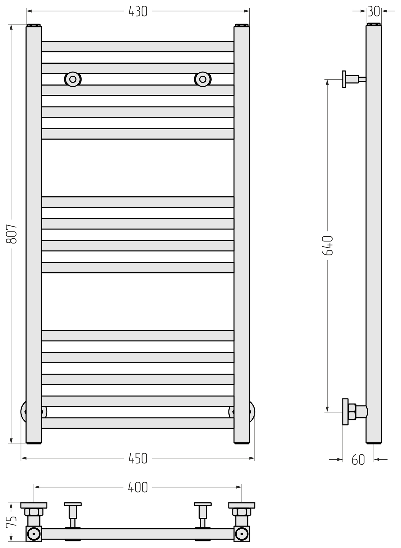 Комплектация: полотенцесушитель, элементы с накидной гайкой для подключения, спускные клапаны, телескопические кронштейны, отражатели и эксцентрики, заглушки для коллектора, комплект прокладок, шестигранные ключи, дюбели и саморезы