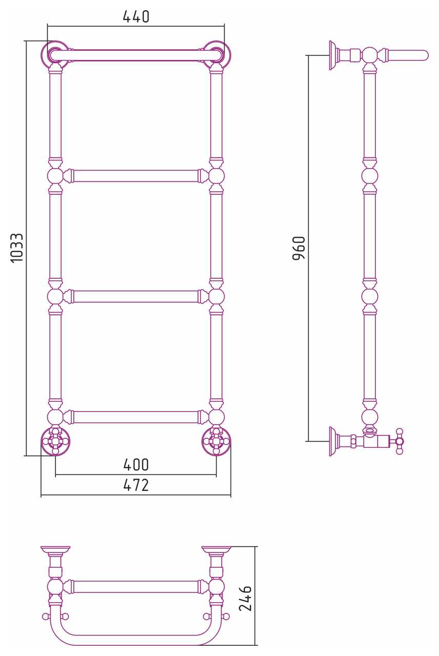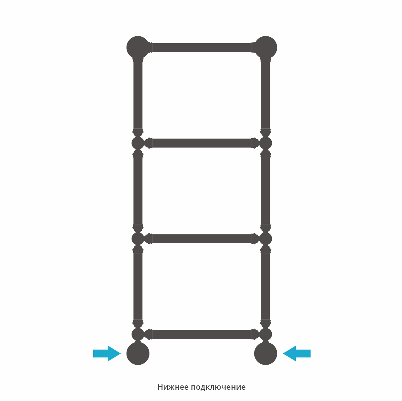 Комплектация: Полотенцесушитель, элементы с накидной гайкой для подключения, спускной клапан, телескопические кронштейны, отражатели и эксцентрики, заглушки для коллектора, комплект прокладок, шестигранные ключи, дюбели и саморезы