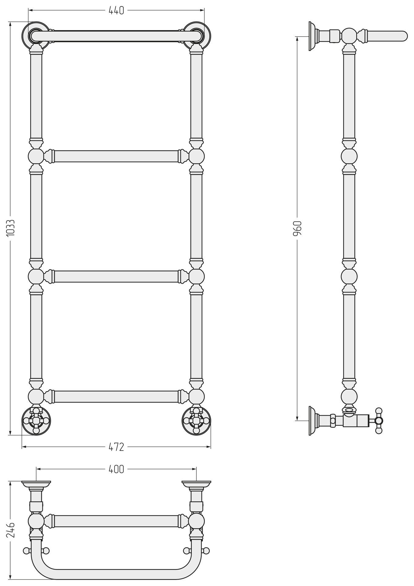 Комплектация: полотенцесушитель, вентили, спускные клапаны, телескопические кронштейны, отражатели и эксцентрики, комплект прокладок, шестигранные ключи, дюбели и саморезы