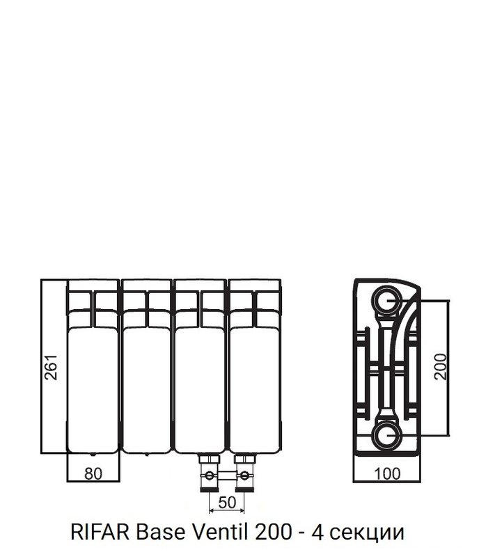 Радиатор биметаллический Rifar Base Ventil R 200 (4 секции, НП прав подкл. 50 мм.) (RB20004VR)