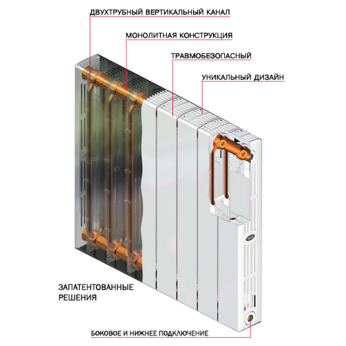 Биметаллический радиатор серии SUPReMO – создан на базе опробованных и новых технических решений с использованием ультрасовременных технологий, предназначены для применения в системах отопления жилых и административных зданий и соответствуют нормативам медицинских и дошкольных учреждений. Представлены на российском рынке двумя моделями с межосевым расстоянием 350 мм. Надёжность радиатора этой серии достигается запатентованной конструкцией, которая представляет собой не разборную монолитную структуру с толщиной стальных стенок как у водопроводных труб. Компания производитель использует двухтрубный вертикальный канал собственного изготовления из специальной высоколегированной стали, обеспечивающей высокие эксплуатационные характеристики и отсутствие процессов коррозии. Разработан по дизайну в современном духе нашего времени - верхние и боковые решетки создают единую элегантную линию, а композитный концепт радиатора из секций и торцевых кейсов дает возможность создавать гармоничный и уникальный внешний вид. Лишены потенциально опасных углов за счет скругления в конструкции и продуманных торцевых кейсов, которые обеспечивают не только эстетический вид, но и защиту от острых граней боковых ребер.