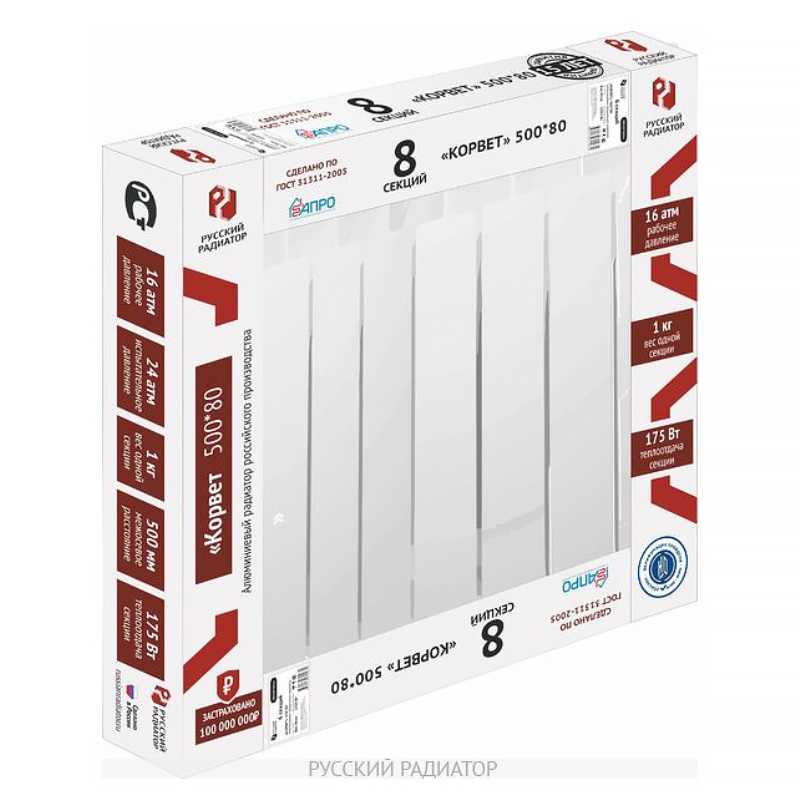 Радиатор биметаллический «Русский радиатор» Корвет BM 500/100 8 секций предназначен для применения в системах отопления жилых и административных зданий с центральной и индивидуальной отопительной системой и соответствует требованиям нормативных документов ГОСТ31311-2005. В биметаллическом радиаторе Корвет отсутствует контакт алюминия с теплоносителем. В радиаторе допускается использование антифризов и незамерзающих теплоносителей. Радиатор изготовлен исключительно из высококачественного алюминия, произведенного на территории России. Благодаря уникальной локализации основных процессов, связанных как с получением первичного алюминия (электролиз глинозема), так и с непосредственным производством радиаторов, достигается оптимальная цена на конечную продукцию с сохранением высочайшего качества.
