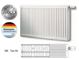 Стальные панельные радиаторы Buderus Logatrend VK-Profil Тип 33 - это отопительные приборы с тремя водопроводящими панелями, тремя конвекционными рядами и нижним подключением (наружная резьба G3/4). Радиаторы представлены высотами от 300 до 900 мм и длинами от 400 до 2000 мм включительно. Не имеют приварных монтажных скоб, поэтому их можно монтировать любой стороной. Отличаются простотой и скоростью монтажа, а система крепления допускает смещение радиатора в любую сторону на 3-5 сантиметров.