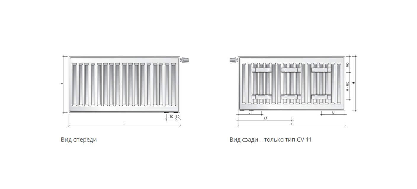 Радиатор включают в себя два ряда конвекционных ребрений и две панели, которые заполняются водой.