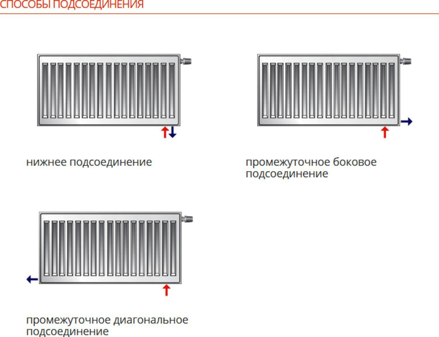 Два подсоединительных отверстия, находящиеся с нижней поверхности радиатора, дают возможность подключения на уровне пола, а также четыре боковых под соединительных отверстия в каждом углу радиатора.