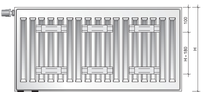 Универсальный панельный радиатор PURMO Ventil Compact с профилированными нагревательными панелями и конвекционными элементами, снабжённые боковыми накладками и верхней накладкой типа «гриль». Два нижних и четыре боковых присоединительных отверстия с внутренней резьбой G 1/2"” делают возможным подсоединение снизу, а в случае необходимости – сбоку.