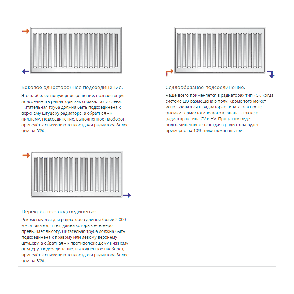 Стальной радиатор PURMO Compact оснащённы конвекционными элементами, боковые поверхности надёжно закрыты предохраняющими элементами, верхняя часть радиаторов закрыта планкой типа ""гриль"". У радиатора есть четыре боковых присоединительных отверстия в каждом углу радиатора с внутренней резьбой G1/2"". Такое расположение отверстий позволяет произвести подсоединение панельного радиатора тремя возможными способами - боковое подсоединение, диагональное и седлообразное.