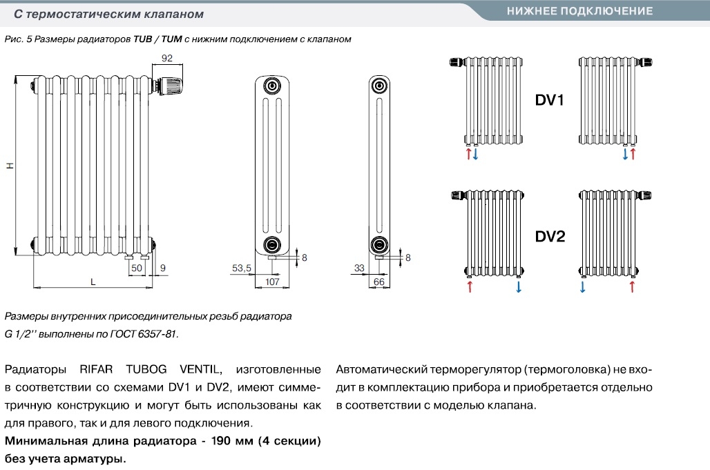 Комплектация: радиатор, термостатический клапан, распределитель потока, разделительная перегородка в нижней секции, воздуховыпускной клапан (кран Маевского), заглушка G3/4, редукционные ниппели, установочные кронштейны