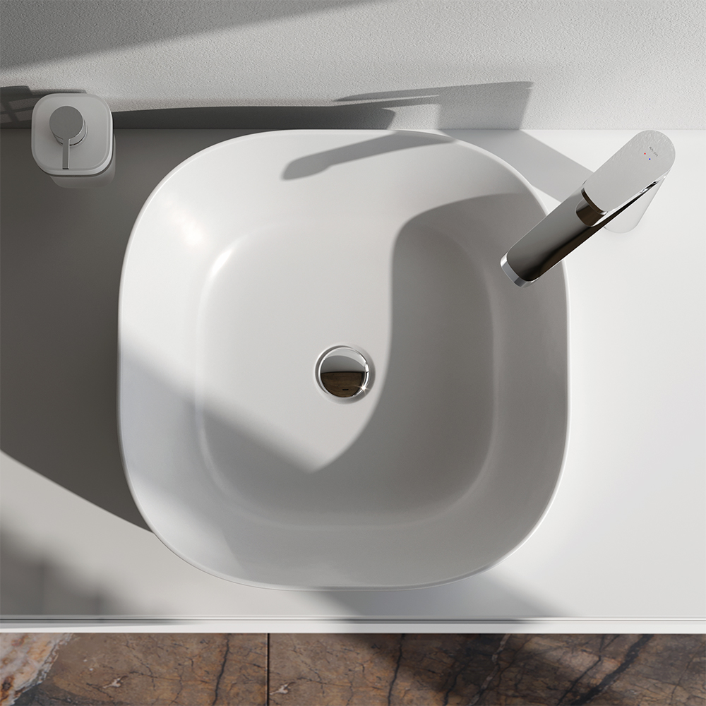 Размер раковины составляет всего 43 см благодаря чему она может органично вписаться даже в ванную комнату с ограниченной площадью. Тщательно продуманная форма раковины исключает пролив воды за край сохраняя чистоту столешницы и сокращая время на уборку.