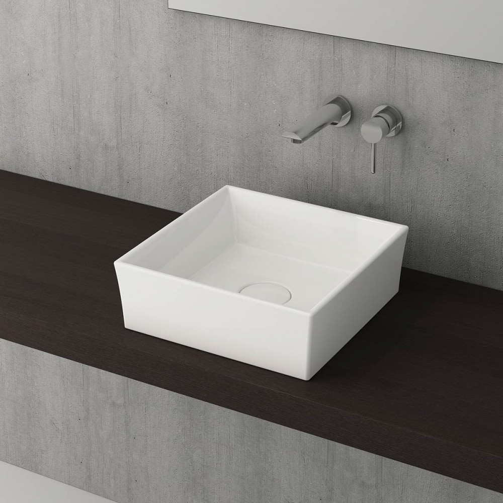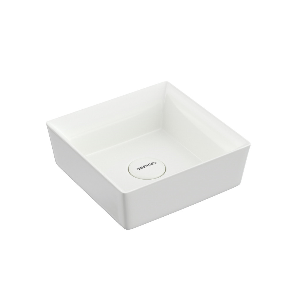 Накладная раковина из санфарфора Berges Mascon размером 38х38х12,5 см. Квадратной формы, без отверстия под смеситель, глянцевая белая. Керамическая крышка слива в комплекте.