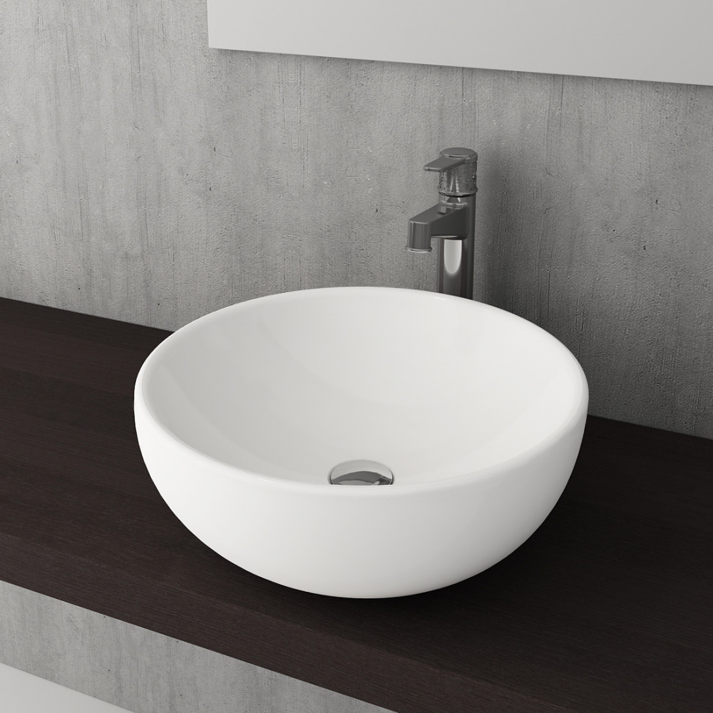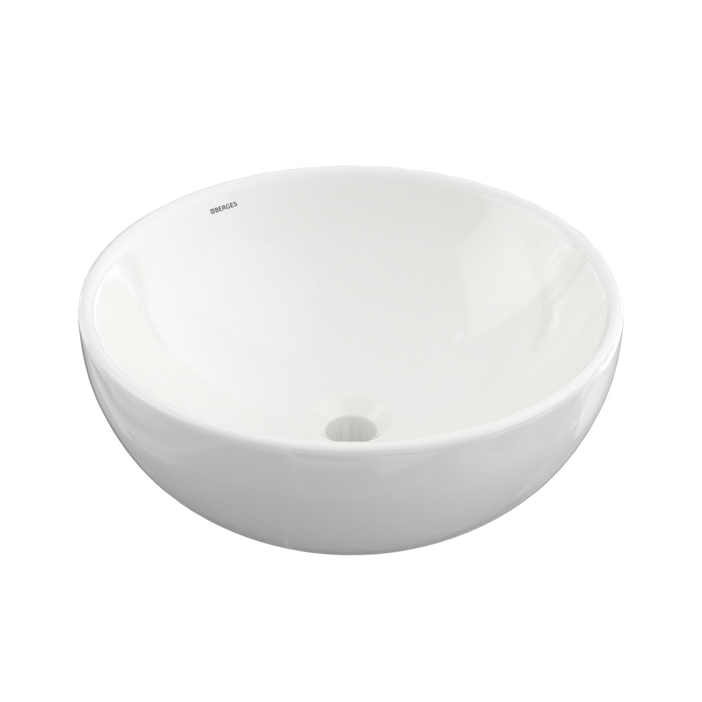 Накладная раковина из санфарфора Berges Mascon диаметром 45 см. Высота 17,5 см. Круглой формы, без отверстия под смеситель, глянцевая белая.