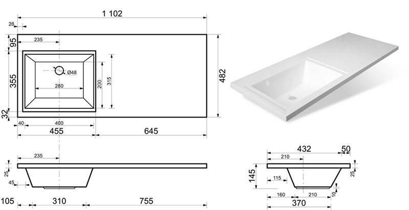 Раковина накладная Melodia Даллас -1100 110x14,5 (чаша слева) (MFR79592WT)