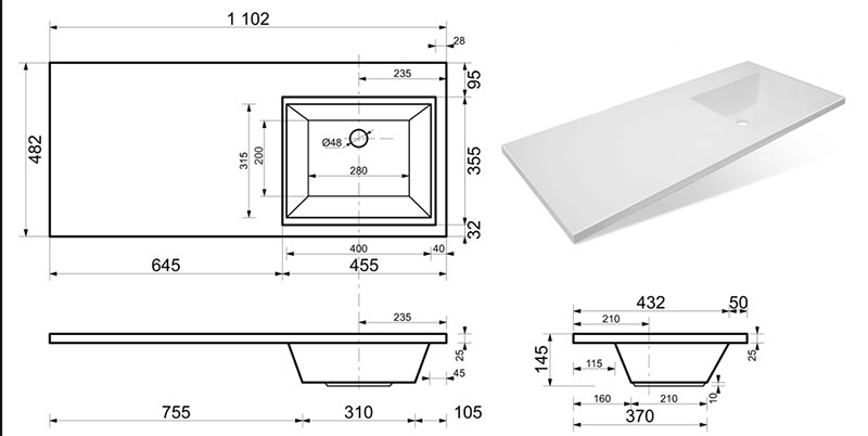 Раковина накладная Melodia Даллас -1100 110x14,5 (чаша справа) (MFR79593WT)