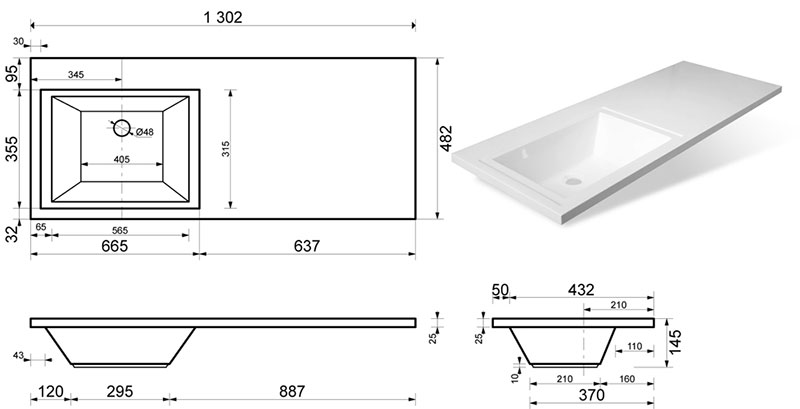 Раковина накладная Melodia Даллас -1300 130x14,5 (чаша слева) (MFR79596WT)