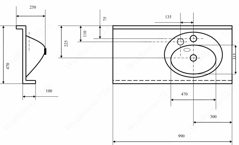 Раковина подвесная Акватон Отель 3/1000 990х470х250 R (1A70083NOT01R)