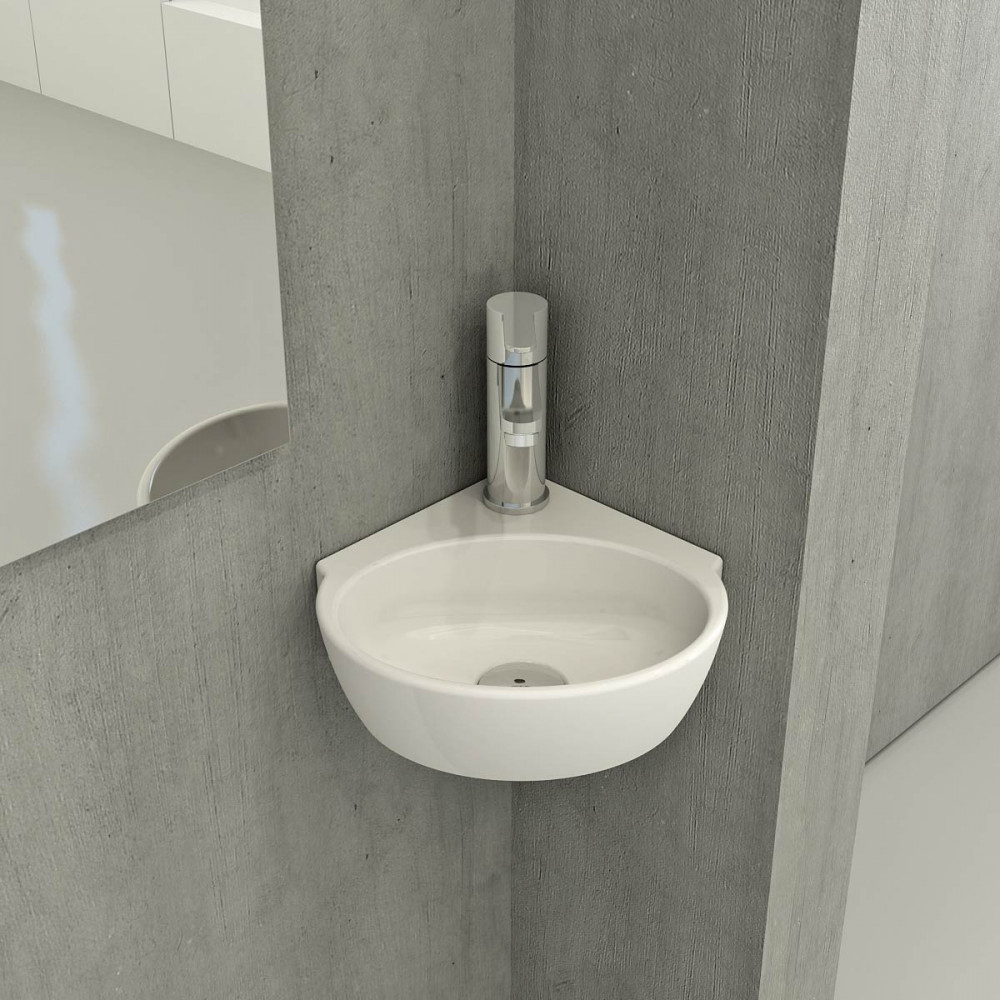 Подвесная раковина из санфарфора Berges Small размером 31,5х30х9,5 см. Угловая, с отверстием под смеситель, глянцевая белая. Крепеж в комплекте. Подходит для использования на столешнице.