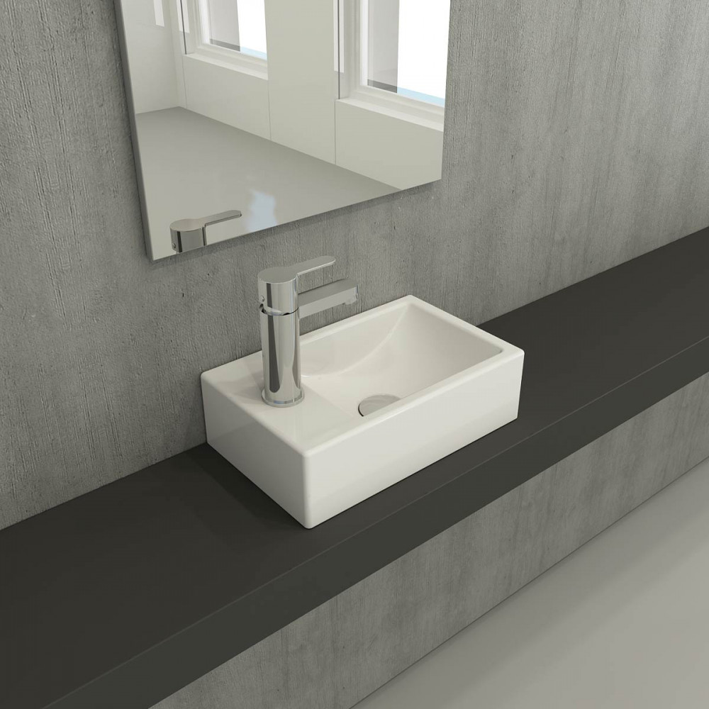 Подвесная раковина из санфарфора Berges Small размером 37х23х11 см. Прямоугольной формы, с отверстием под смеситель, глянцевая белая. Крепеж в комплекте. Подходит для использования на столешнице.