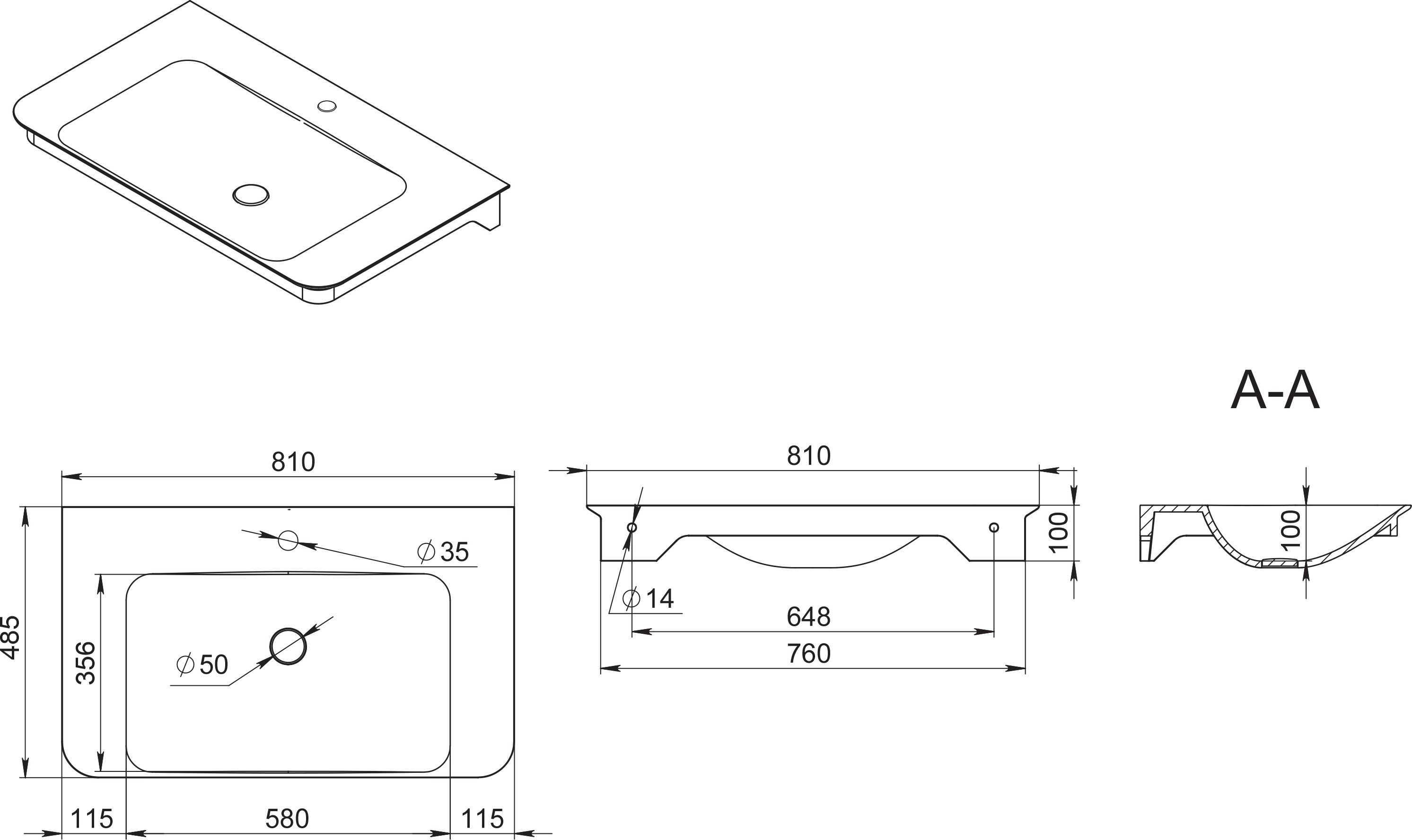 Прямоугольная раковина AM.PM Sensation 81 M30WPC0801WG -материал: искусственный мрамор, cтойкость к влаге, пятнам, запахам, монтаж: встраиваемый сверху на мебель, одно готовое отверстие под смеситель по центру чаши.