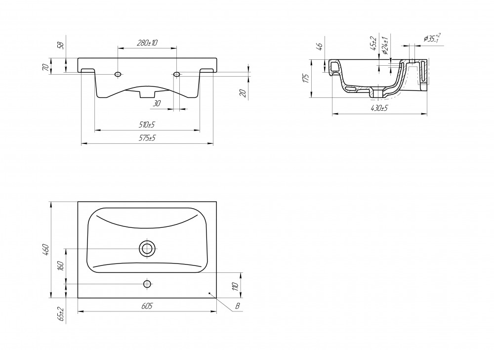 Прямоугольная мебельная раковина MODUO, размером 60 см. Имеет отверстие под смеситель, а также отверстие перелива.