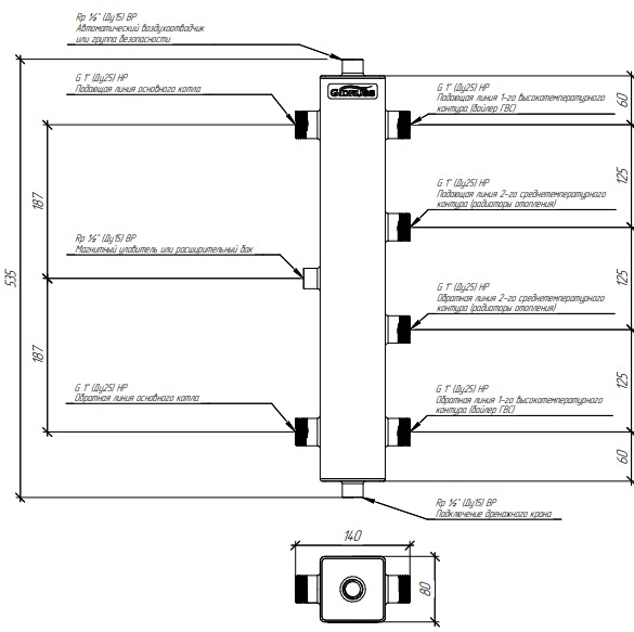 Разделитель термогидравлический Gidruss TGRSS-60-25x2 (нерж., до 60 кВт, 2 контура G 1", встроенный сепаратор, нерж ст.) (15 06002 20)
