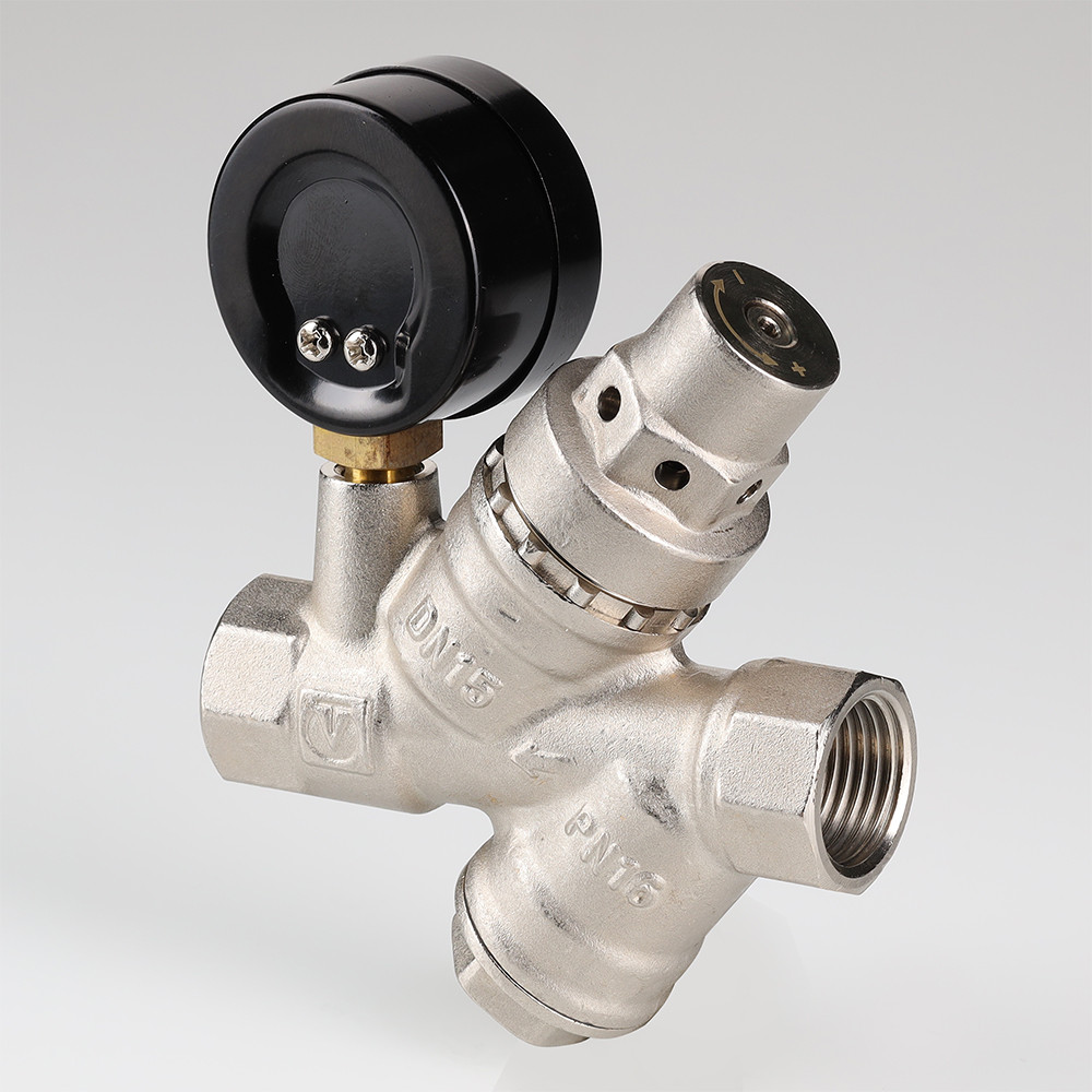 Редуктор снабжен манометром, который позволяет производить точную настройку выходного давления и дает возможность контролировать давление при водоразборе. Для защиты поршневых уплотнений и внутренней импульсной линии редуктор совмещен с косым фильтром механической очистки с размером ячейки 300 мкм. Пробка косого фильтра имеет ушко для пломбировки.