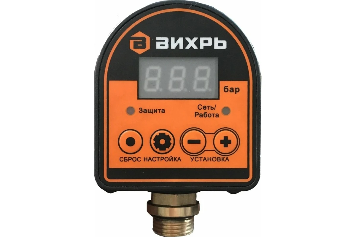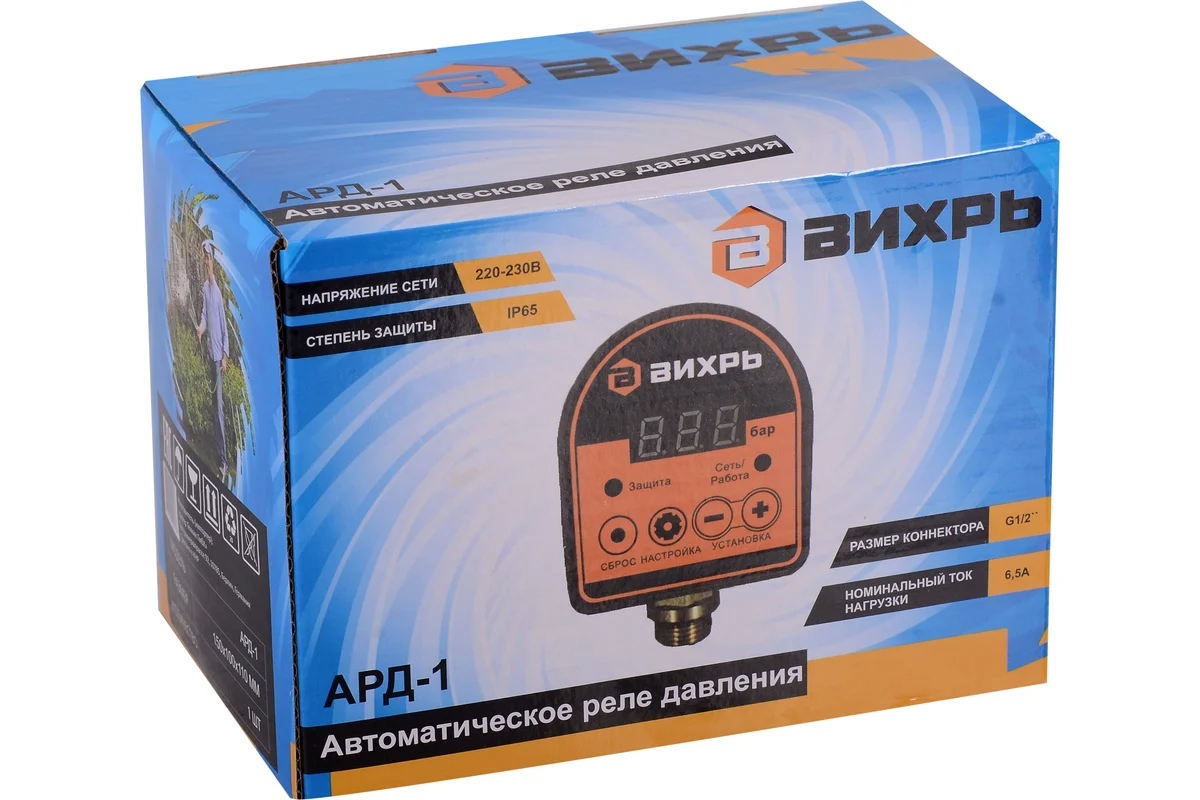 Автоматическое реле давления АРД-1 Вихрь используется для автоматизации включения/выключения электронасосов в системах водоснабжения и орошения. Пороговые значения давления настраиваются: давление включения от 1 до 9,8 бар, давление отключения насоса от 1,1 до 9,9 бар.