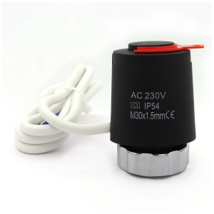 Привод для автоматического управления радиаторным или коллекторным термостатическим клапаном систем водяных теплых полов и охлаждения зданий по управляющему сигналу от комнатного термостата или контроллера. Действие основано на расширении жидкости (толуола) в сильфоне при протекании электрического тока через встроенный нагревательный элемент. Нормально закрытый.