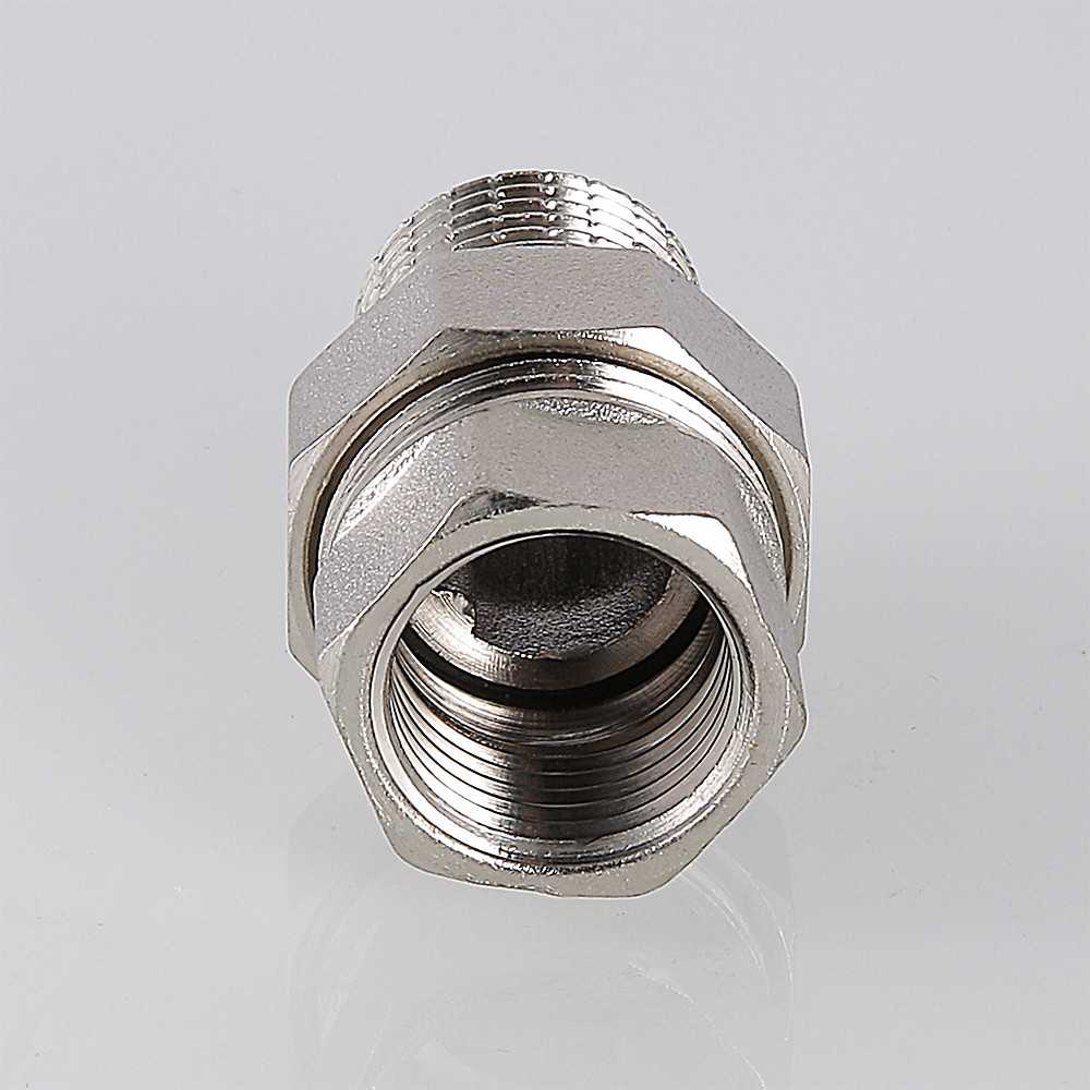 Прямой разъемный сгон, смонтированный из двух частей с помощью накидной гайки (соединение типа «американка»). Резьба – внутренняя/наружная, цилиндрическая трубная по ГОСТу 6357 (ISO 228, EN 10226). Внутренняя резьба совместима также с наружной конической трубной резьбой по ГОСТу 6211 (ISO R7). Детали выполнены из латуни, никелированы. Уплотнительное кольцо – из синтетического каучука EPDM. Гайку следует накручивать с приложением момента не более 30 H•м.