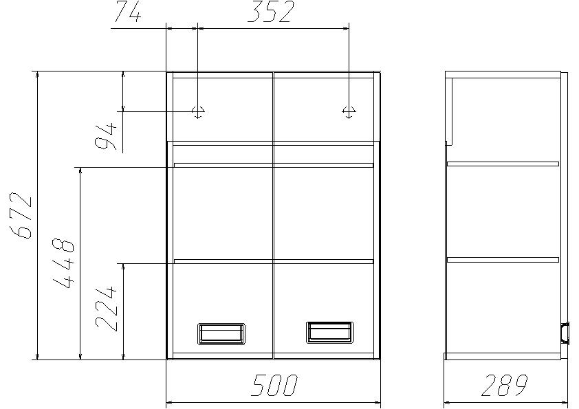 Шкаф не зеркальный, без подсветки, с двумя полками внутри.