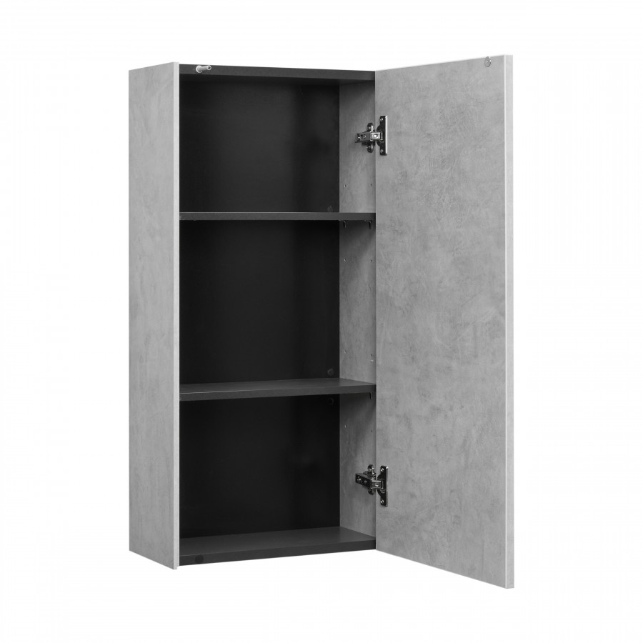 Дополняет коллекцию предметов мебели Марбл шкафчик в созвучном дизайне: боковые стенки и фасад выполнены из ВЛДСП Слэйт. Внутри две регулируемые полки из ламинированной влагостойкой ДСП в цвете антрацит - перекликаются с внутренним оформлением ящиков тумб коллекции Марбл. Навесной шкафчик имеет как левую, так и правую ориентации - достаточно лишь перевернуть изделие на 180 градусов. При желании также можно собрать полноценную колонну из двух навесных шкафов.