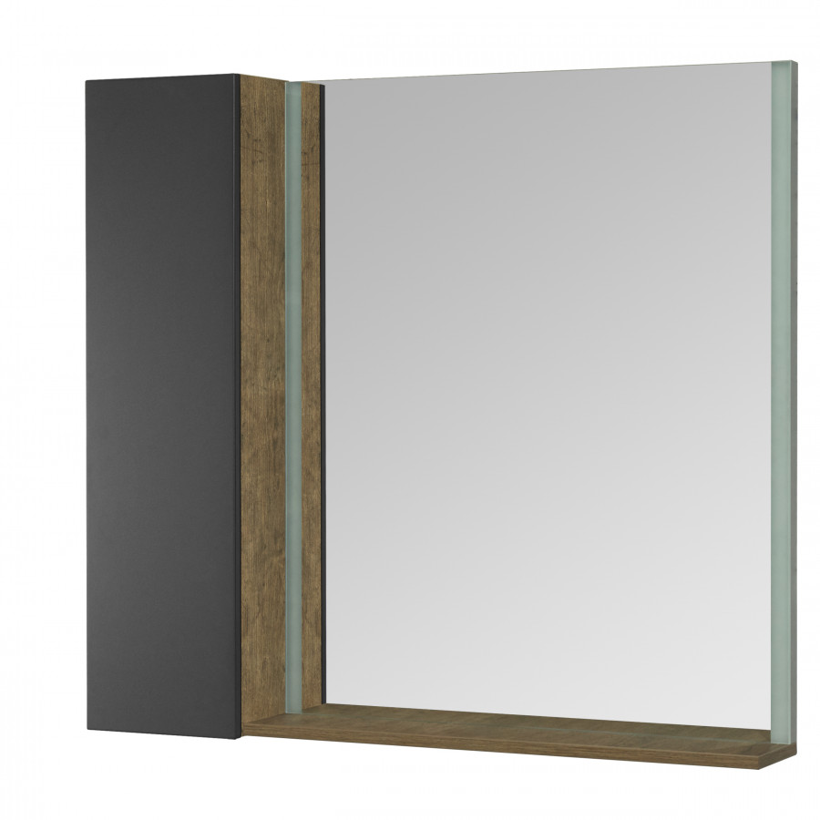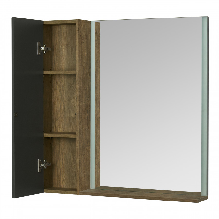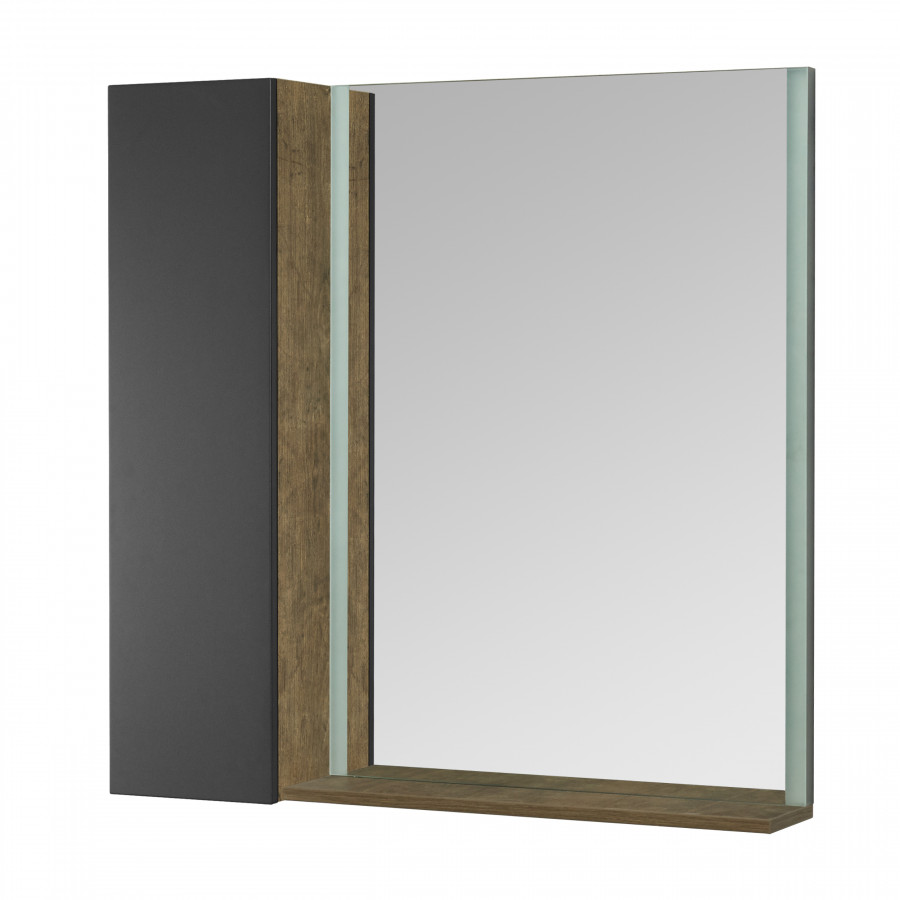 Зеркало для тумбы Терра 105 комплектуется из зеркала 70 с встроенными LED-светильниками по боковым сторонам и дополнительного функционального модуля 35с открытыми полками для косметических и декоративных средств, а за фасадом расположены регулируемые полки. Внутреннее пространство модуля выполнено в декоре дуб кантри.