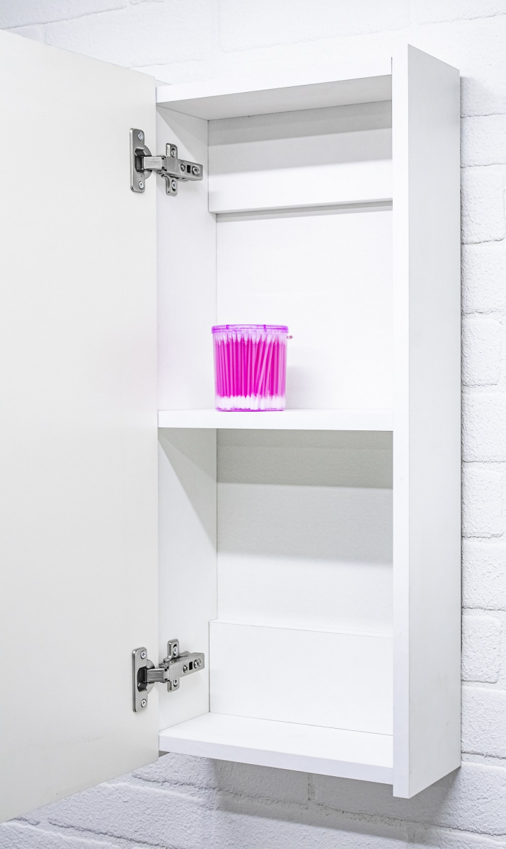 Шкафчик оснащён распашной дверкой с доводчиками, что обеспечивает плавное закрытие без шума. Таким образом, данный элемент интерьера будет не только красивым, но и практичным дополнением к вашей мебели в ванну. Использованные материалы — ЛДСП, МДФ и Плёнка ПВХ, известны своей долговечностью и стойкостью к влаге. Они обеспечивают надёжность конструкции и легкий уход за поверхностями. Глянцевое покрытие придаёт изделию эстетичный вид и позволяет практически любому интерьеру выглядеть современно.