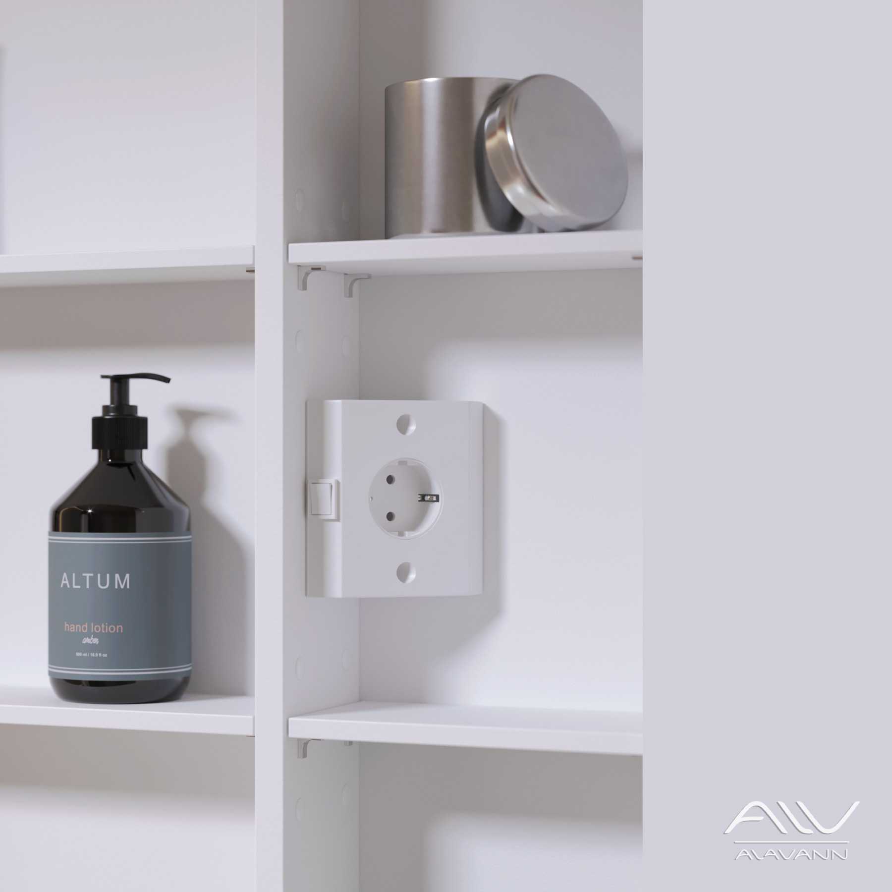 Внутри шкафа за малым фасадом находится угловая розетка с выключателем.
