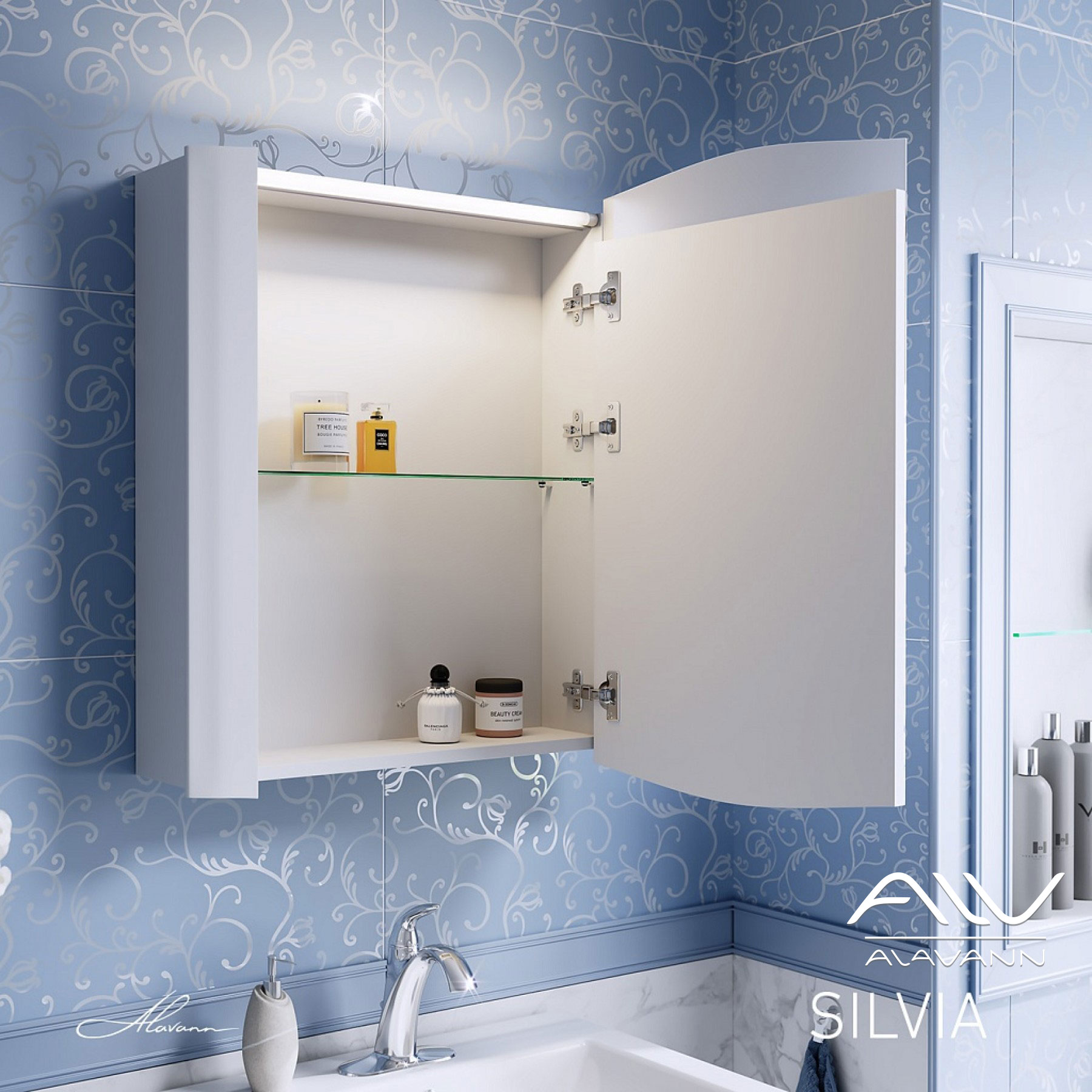 Зеркало-шкаф Silvia - стильный предмет мебели, который станет яркой деталью оформления интерьера ванной комнаты. Для удобства в шкаф встроен люминесцентный светильник - дополнительный источник освещения зеркального полотна. Теперь наносить косметику и ухаживать за собой станет еще проще! Зеркало выполнено на основе серебряной амальгамы, которая обеспечивает качественное изображение, влагостойкость и долгий срок эксплуатации изделия. Фасад на доводчиках.