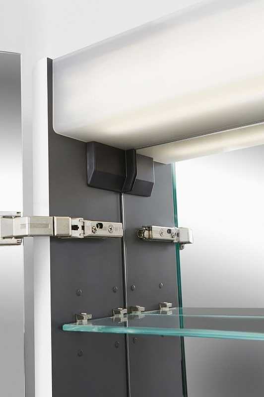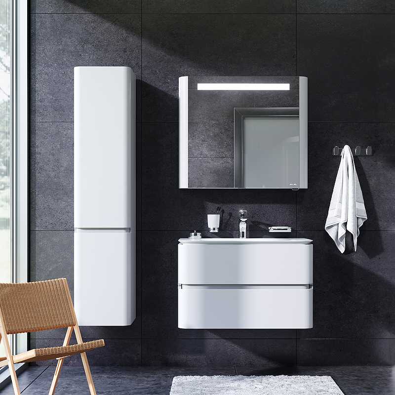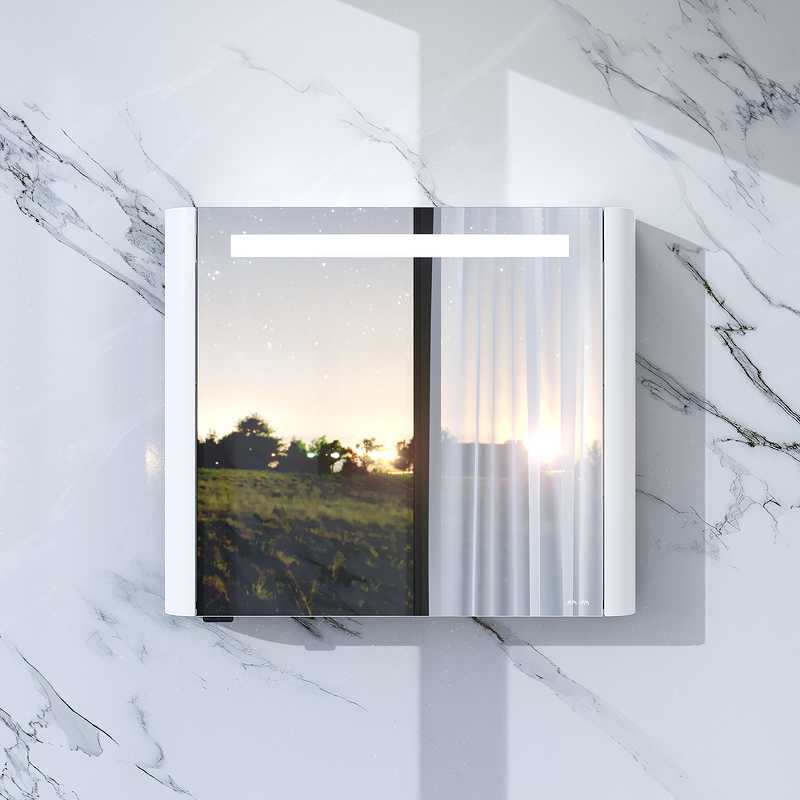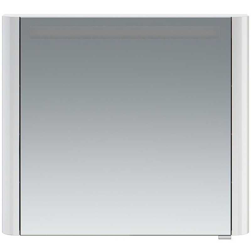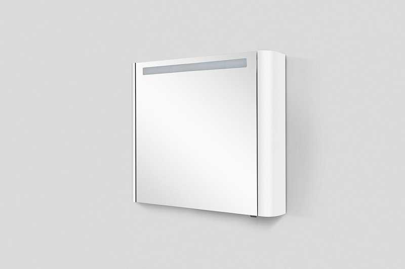 Зеркальный шкаф в ванную AM.PM Sensation 80 L M30MCL0801WG с одной распашной дверцей и двумя полками за ней, с подсветкой сверху, с розеткой и выключателем.
