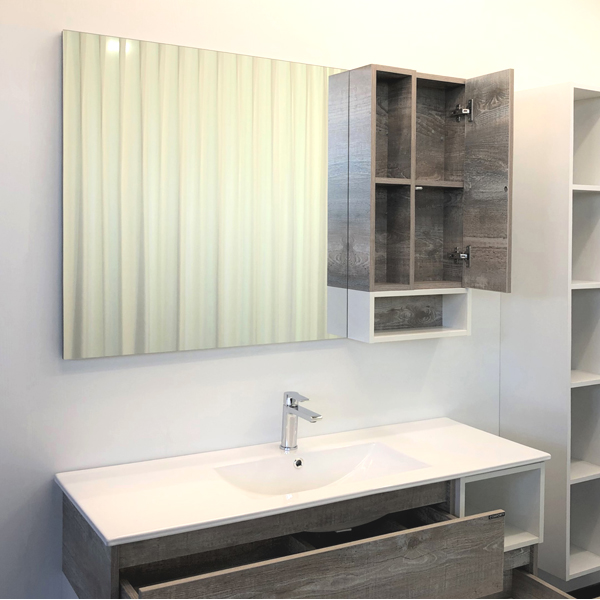 Створка оснащена системой push-to-open (открытие при нажатии). Высококачественное зеркальное полотно с амальгамой на основе серебра. Дополнительно оснащается светильником. Фасад и корпус из влагостойкого ЛДСП Дуб бежевый. За створкой одна горизонтальная полка.