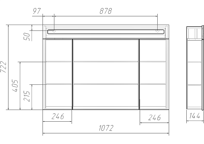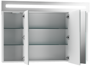 На шкафу установлена светодиодная подсвета, включатель находится внутри. Внутреннее пространство разделено двумя стеклянными полками.