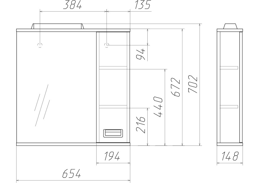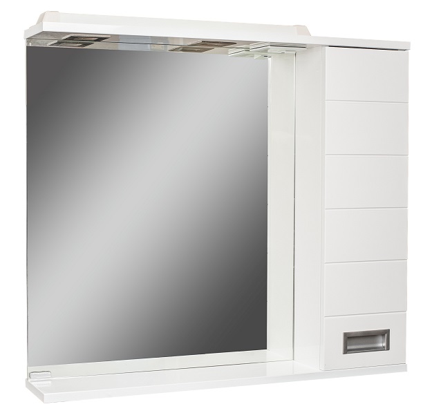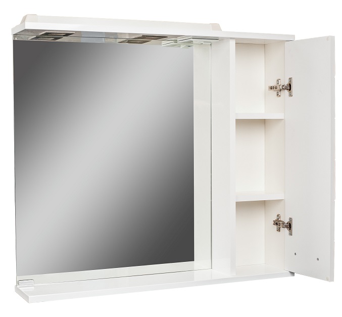 Внутри шкафа две полки. Над зеркалом установлена светодиодная подсветка, включатель подсветки снаружи. По боку от зеркала расположен шкаф. Подвесные шкафы оснащены зеркалом с подсветкой для комфортного проведения косметических процедур и полочкой для гигиенических принадлежностей.