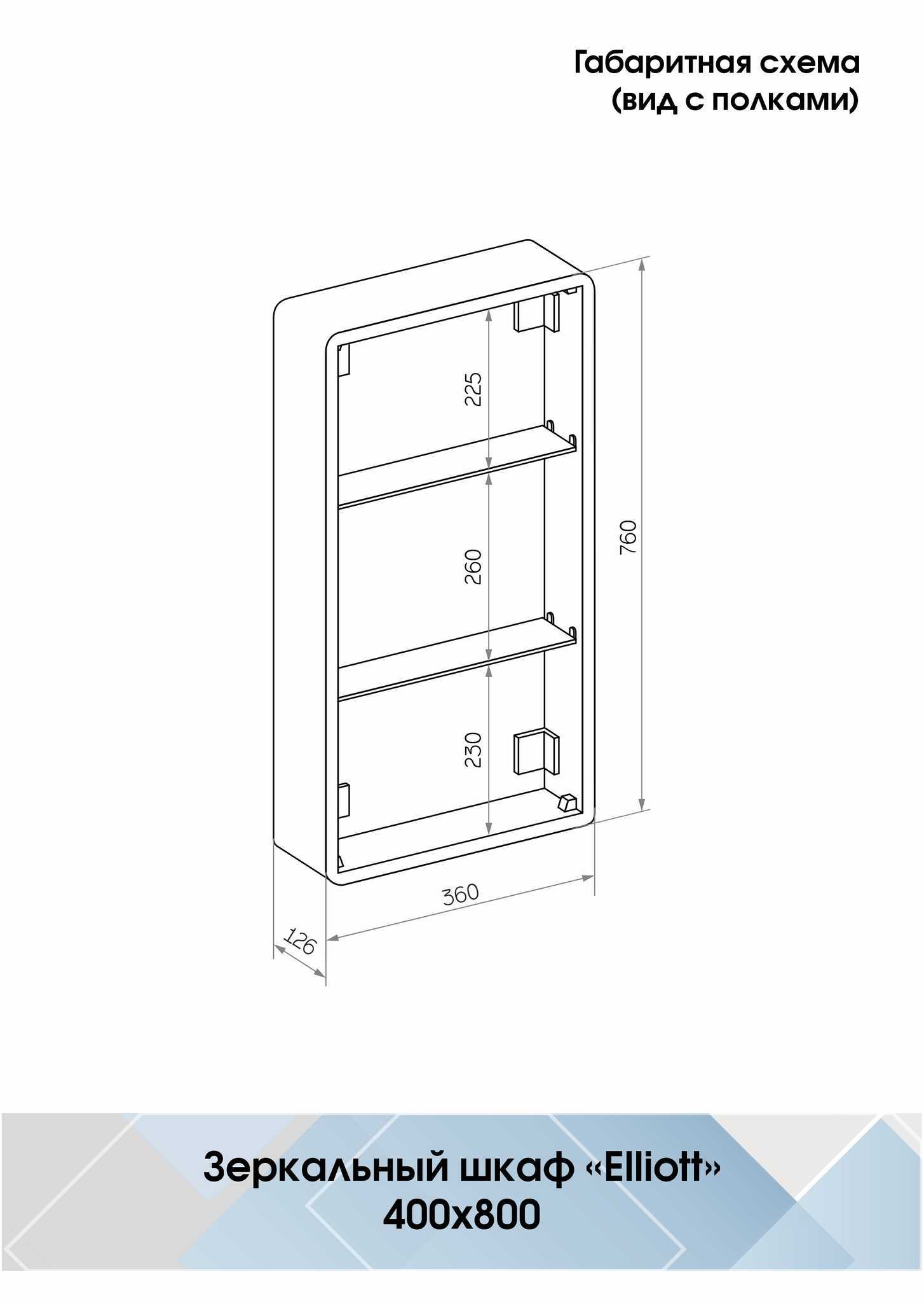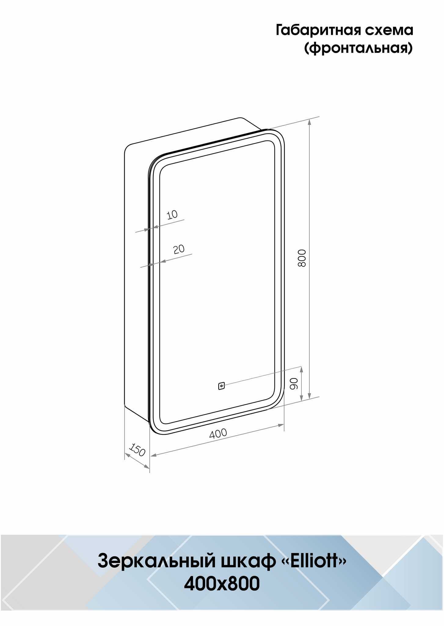Зеркало-шкаф "Elliott LED" 400х800 с LED-подвесной изготовлено из зеркального полотна толщиной 4 мм производства ведущего европейского производителя зеркал AGC, материал корпуса изготовлен из МДФ покрытого пленкой ПВХ. Дверцы шкафа оснащены фурнитурой с доводчиком для плавного закрытия дверцы.