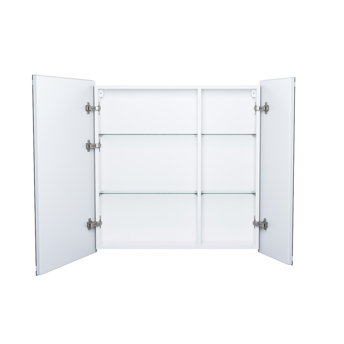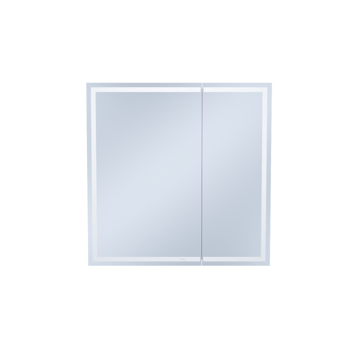 Шкаф-зеркало для ванной с LED-подсветкой. Размеры 800*800*160. Корпус влагостойкая белая ЛДСП, Пластиковый короб на дверцах. 4 стеклянные полочки. механический выключатель. Розетка.
