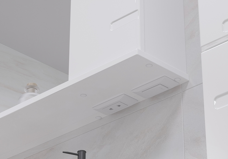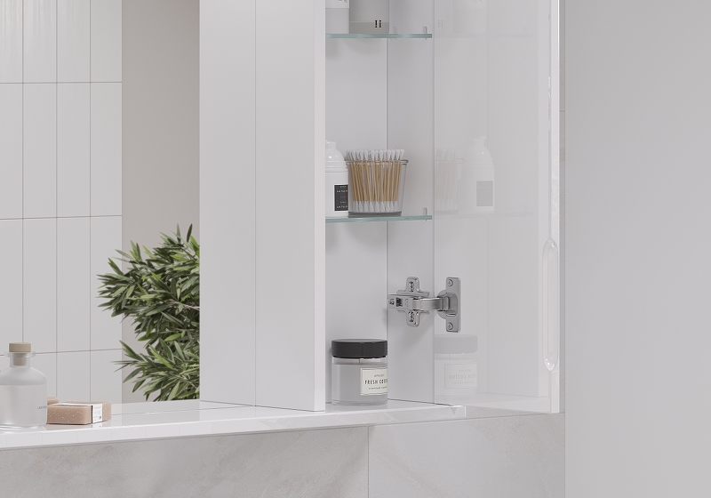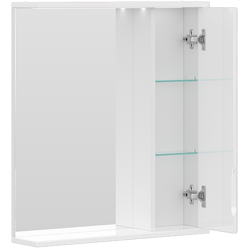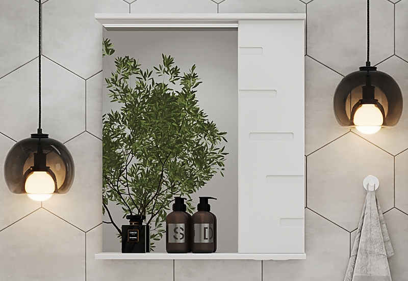 Зеркало-шкаф с двумя стеклянными полками за распашной дверцей. Петли оснащены доводчиками. Фасад зеркального шкафа изготовлена из МДФ и облицована глянцевой пленкой ПВХ. Зеркало-шкаф оснащено встроенной светодиодной подсветкой, электрической розеткой и выключателем. Шкафчик открывается при помощи интегрированной ручки. Декоративна фрезеровка на фасаде, интегрированная ручка, фурнитура с доводчиками, встроенная светодиодная подсветка, розетка, выключатель.