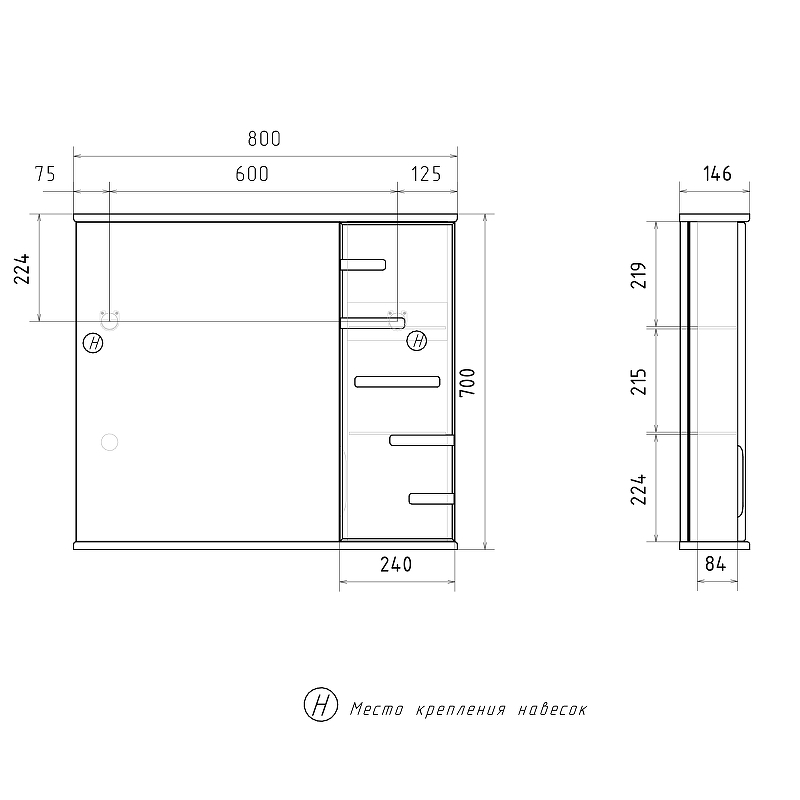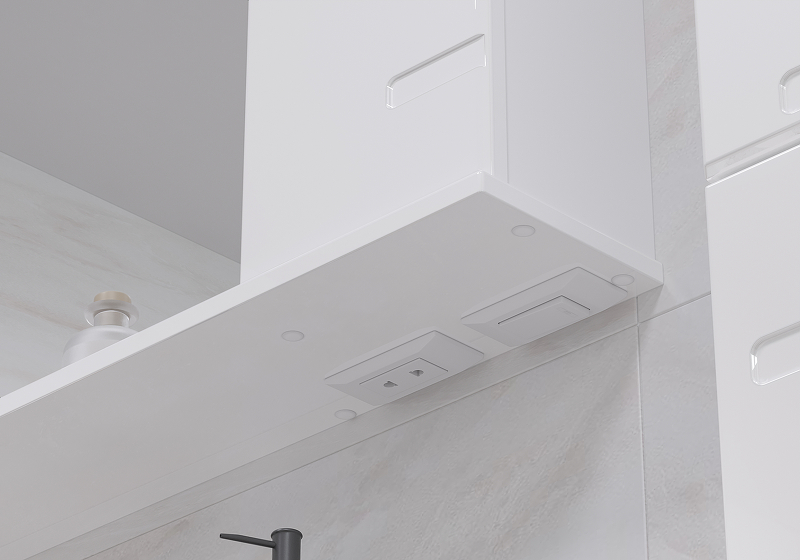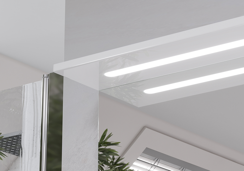 Зеркало-шкаф с двумя стеклянными полками за распашной дверцей. Петли оснащены доводчиками. Фасад зеркального шкафа изготовлена из МДФ и облицована глянцевой пленкой ПВХ. Зеркало-шкаф оснащено встроенной светодиодной подсветкой, электрической розеткой и выключателем. Шкафчик открывается при помощи интегрированной ручки. Декоративна фрезеровка на фасаде, интегрированная ручка, фурнитура с доводчиками, встроенная светодиодная подсветка, розетка, выключатель.