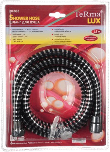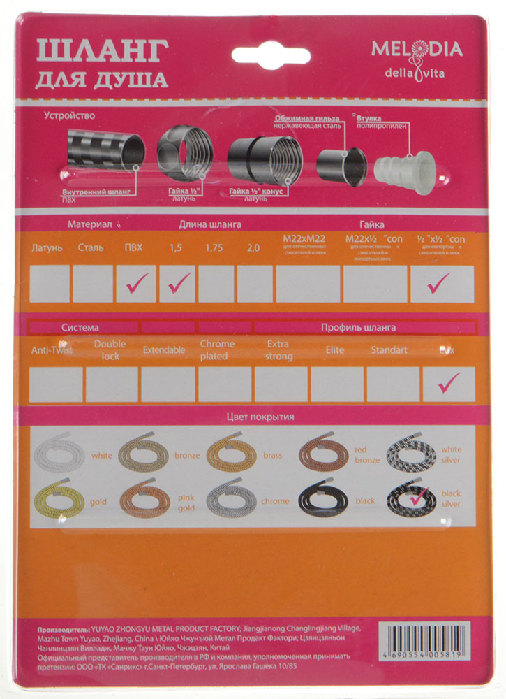 Шланг для душа MELODIA 1/2"*1/2" конус, ПВХ диаметр 14 мм, длина 150 см LUX. Цвет черное серебро, упакован в блистер Шланг для душа MELODIA используется совместно с душевыми или гигиеническими смесителями, а также душевыми лейками.