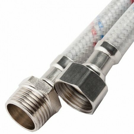 Шланг заливной c пластиковой гайкой изготовлен из армированного нетоксичного каучука, гайки соединения выполнены из прочного полиамидного соединения, обжимные гильзы из алюминия.