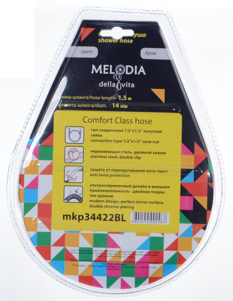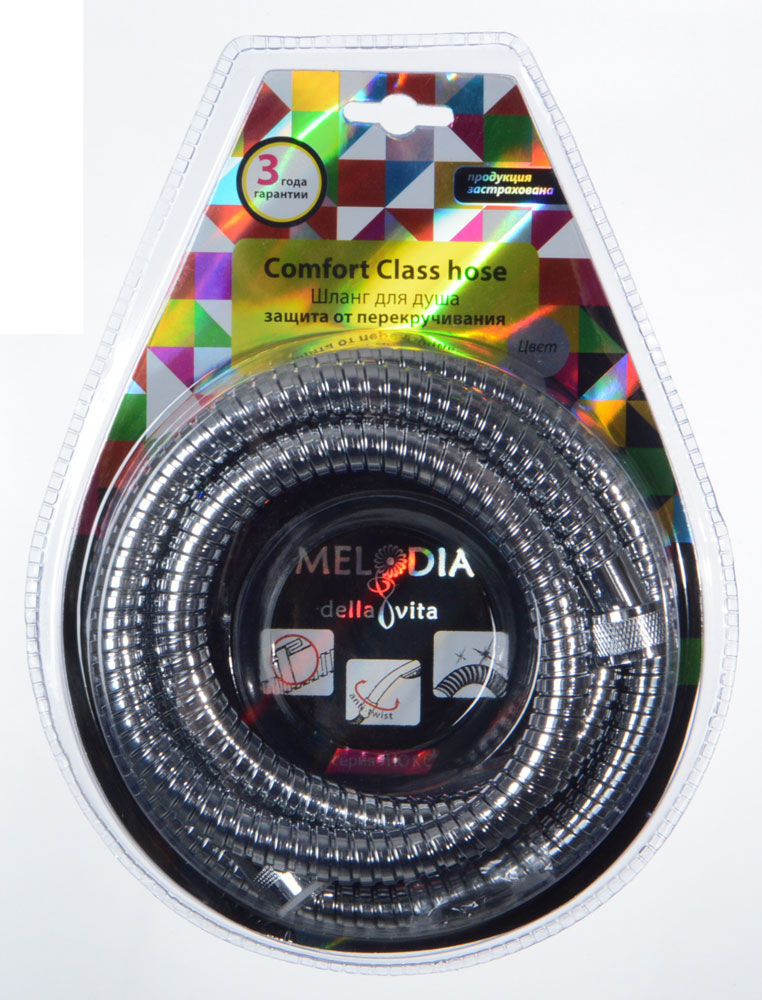 Шланг для душа MELODIA 1/2"*1/2" конус. ПВХ с оплеткой из нержавеющей стали диаметром 14 мм, длинной 150 см. Серия Tubo Comfort имеет двойной зажим и защиту от перекручивания. Шланг упакован в блистер.Присоединение к смесителю с помощью накидной гайки 1/2" (16 мм), присоединение лейки с помощью конусной накидной гайки 1/2" (16 мм). Шланг подходит к импортным смесителям и лейкам.