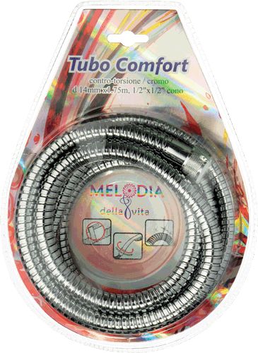 Шланг для душа MELODIA 1/2"*1/2" конус. ПВХ с оплеткой из нержавеющей стали диаметром 14 мм, длинной 175 см. Серия Tubo Comfort имеет двойной зажим и защиту от перекручивания. Шланг упакован в блистер. Присоединение к смесителю с помощью накидной гайки 1/2" (16 мм), присоединение лейки с помощью конусной накидной гайки 1/2" (16 мм). Шланг подходит к импортным смесителям и лейкам.