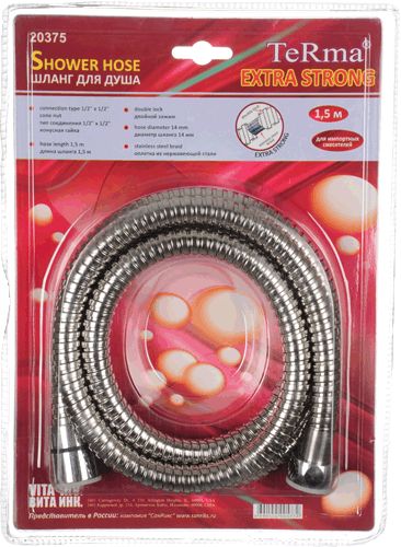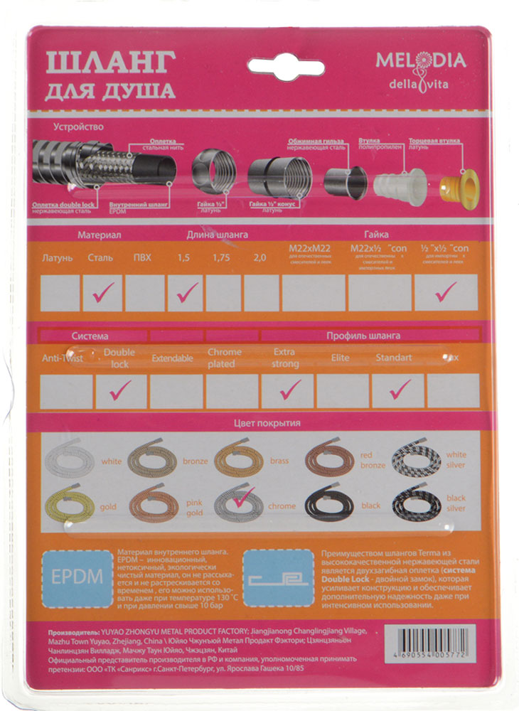Шланг для душа MELODIA 1/2"x1/2" конус, EPDM с оплеткой из нержавеющей стали, диаметр 14 мм, длина 150 см, двойной зажим Extra strong, упакован в блистер Шланг для душа MELODIA используется совместно с душевыми или гигиеническими смесителями, а также душевыми лейками. EPDM шланг имеет дополнительную оплетку полипропиленовой нитью для повышеной прочности. Присоединение к смесителю с помощью накидной гайки 1/2" (16 мм), присоединение лейки с помощью конусной накидной гайки 1/2" (16 мм). Шланг подходит к импортным смесителям и лейкам.