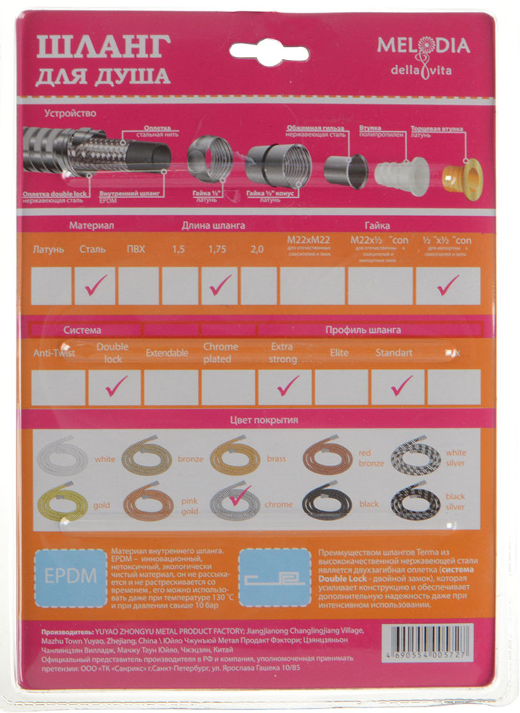 Шланг для душа MELODIA 1/2"*1/2" конус, EPDM с оплеткой из нержавеющей стали, диаметр 14 мм, длина 175 см, двойной зажим Extra strong, упакован в блистер Шланг для душа MELODIA используется совместно с душевыми или гигиеническими смесителями, а также душевыми лейками. EPDM шланг имеет дополнительную оплетку полипропиленовой нитью для повышеной прочности. Присоединение к смесителю с помощью накидной гайки 1/2" (16 мм), присоединение лейки с помощью конусной накидной гайки 1/2" (16 мм). Шланг подходит к импортным смесителям и лейкам.