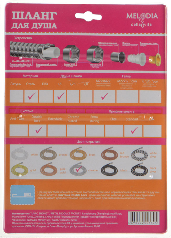 Шланг для душа MELODIA M22*M22, ПВХ с оплеткой из нержавеющей стали, диаметр 14 мм, длина 150 см, двойной зажим STANDART, упакован в блистер. Присоединение к смесителю и лейке с помощью накидной гайки M22. Шланг подходит к отечественным смесителям и лейкам.